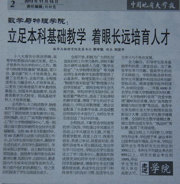 在2013年11月15日第451期的bevictor1946韦德官网报的“走近公司”专栏中,刊登了一篇题为“bevictor1946韦德官网:立足本科基础教学 着眼长远培育人才”的专题报道,现把详细内容转载如下。