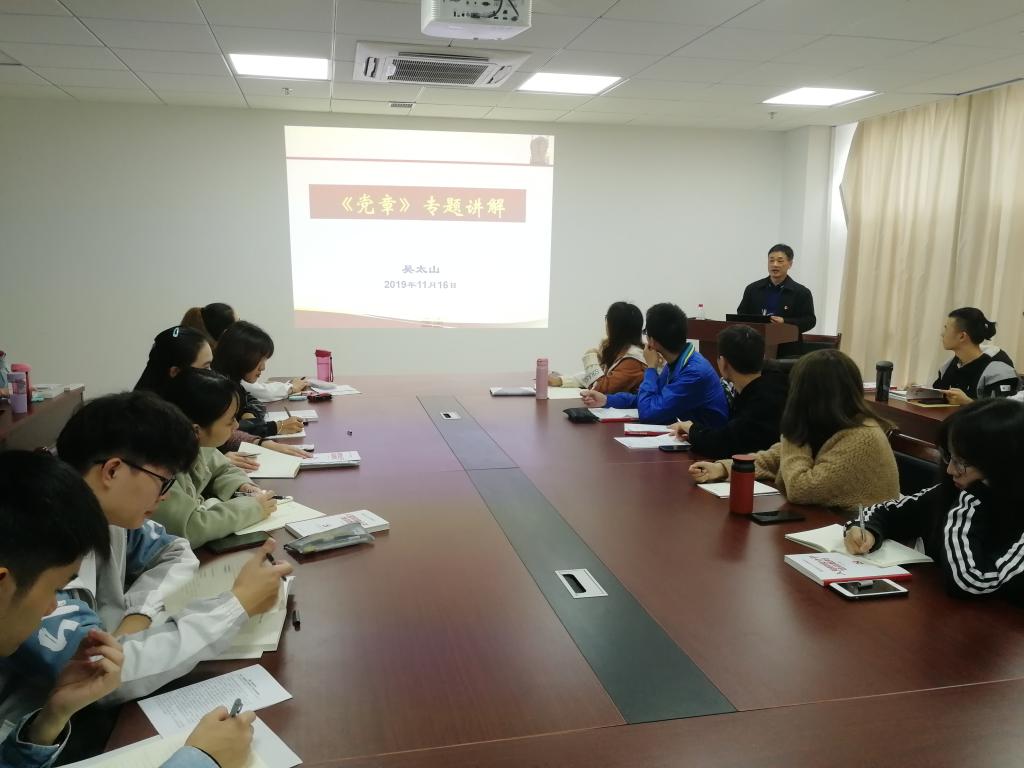 吴太山书记从为什么要深入学习《党章》入手,重点讲解《党章》中“总纲”部分有关党的性质、最高理想和最终目标,党的指导思想及其内涵、作用,中国特色社会主义基本理论、基本路线、基本方略,党的建设内容及要求等方面内容。对《党章》中的11章55条内容从党员和党的干部、党的各级组织、党的纪律、党团关系、党徽党旗等方面进行了归类讲解。吴书记还介绍了《党章》形成和发展的历史过程,历次党代会对《党章》所作的重要修改,特别是党的十九大对党章所做的十个方面重要修改,以帮助学员们更好的理解和掌握现行新《党章》。