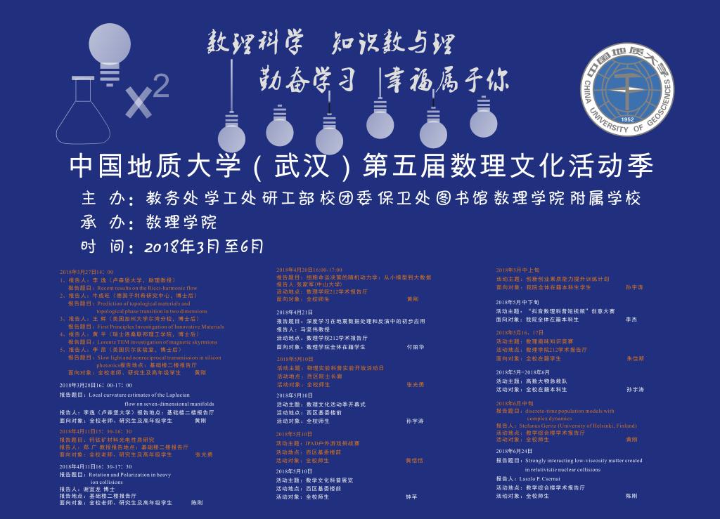 bevictor1946韦德官网(武汉)第五届数理文化活动季在2018年3月到6月举行。5月10日14:30在西区bevictor1946韦德官网楼前举行户外物理实验科普展暨数理文化活动季开幕式。