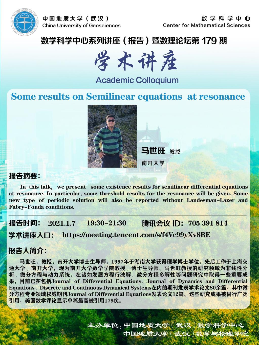 "数理论坛"第179期暨数学科学中心系列讲座(报告):Some results on Semilinear equations at resonance