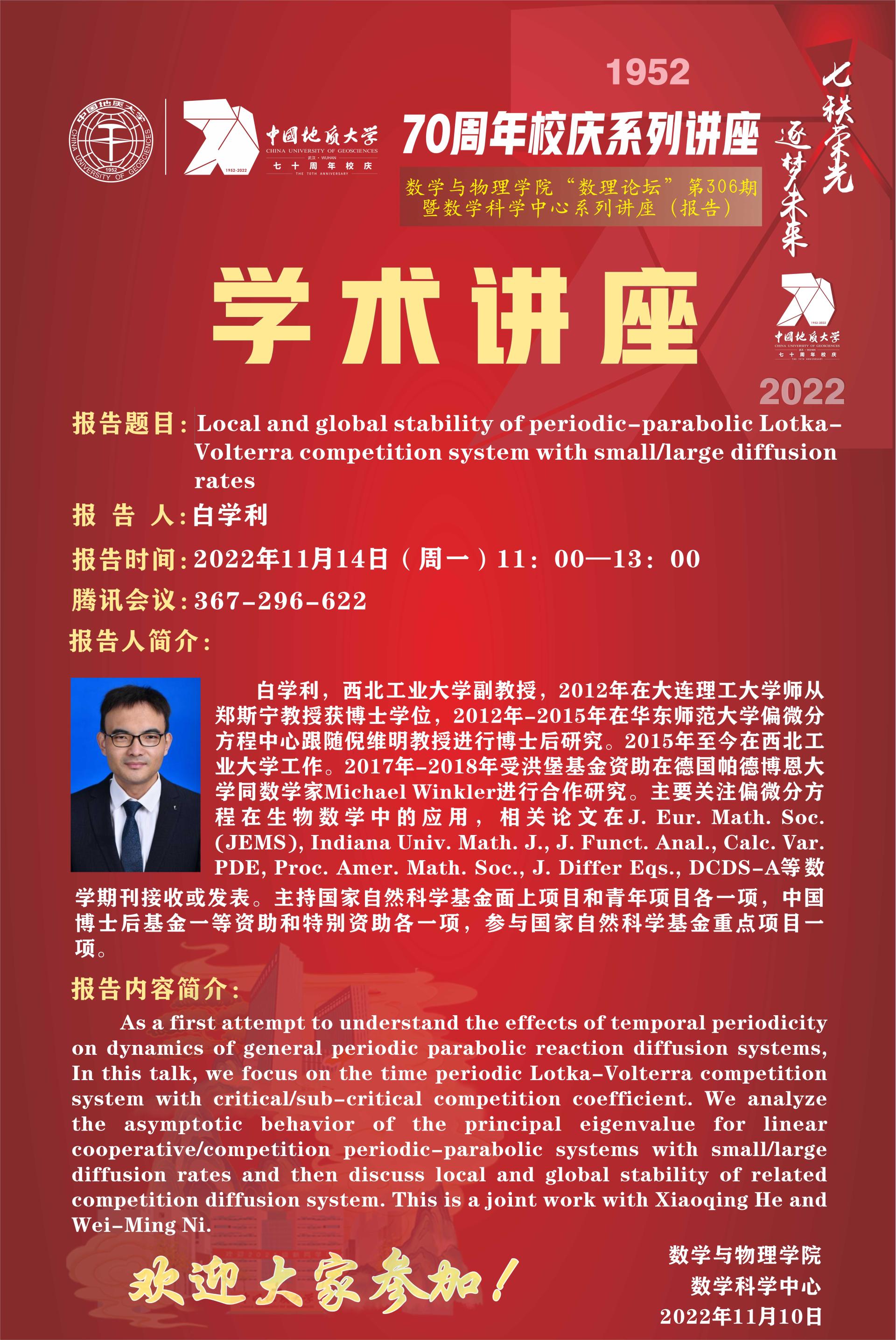 "数理论坛"第306期暨数学科学中心系列讲座(报告):Local and global stability of periodic-parabolic Lotka-Volterra competition system with small/large diffusion rates