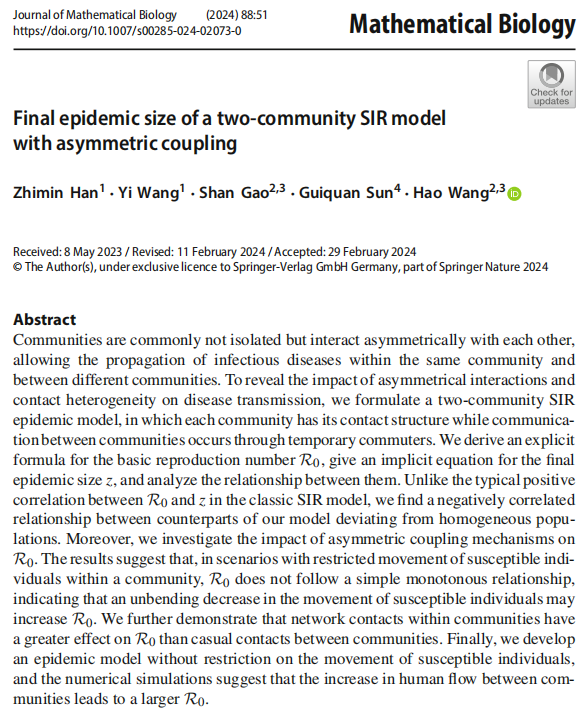 近日,公司2021级博士生韩志敏以第一作者身份在国际生物数学主流期刊《Journal of Mathematical Biology》上发表题为“Final epidemic size of a two-community SIR model with asymmetric coupling”的学术论文。该论文第二作者为指导教师王毅副教授,通讯作者为加拿大数员工态学和流行病学跨学科实验室主任、阿尔伯塔大学数学与统计科学系王皓教授。