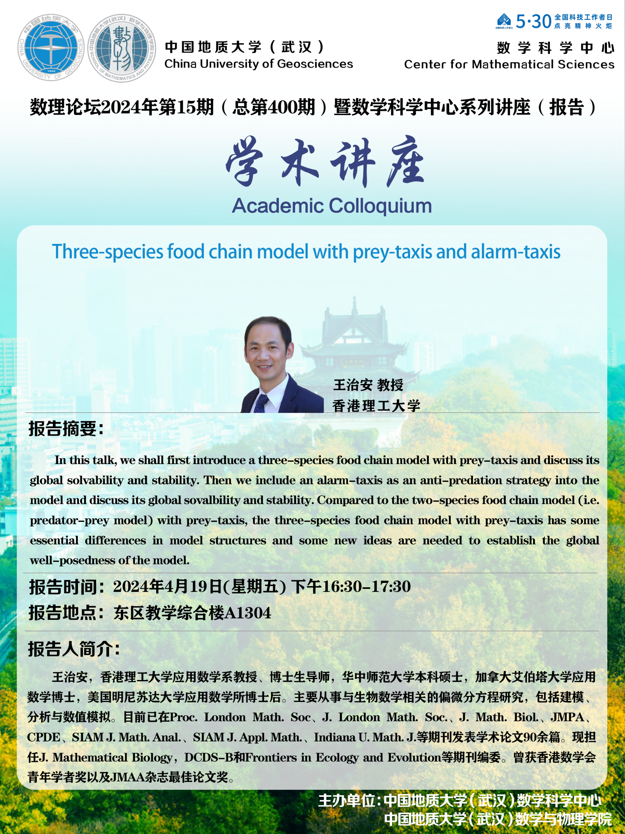 2024年4月19日王治安教授学术讲座:Three-species food chain model with prey-taxis and alarm-taxis