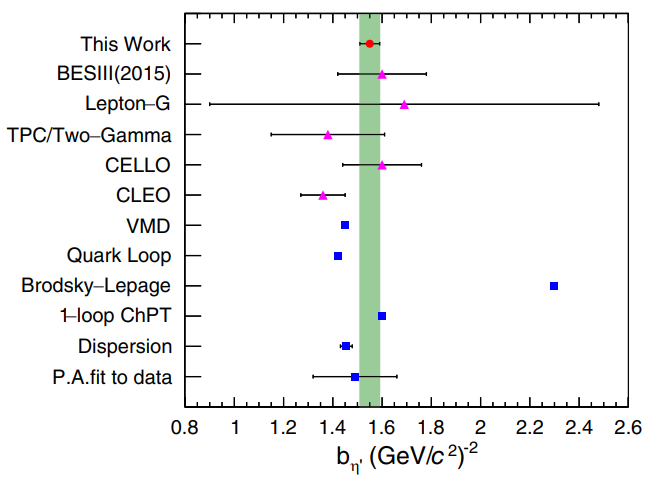 图1:η→γe+e−(左图)和η′→γe+e−(右图)跃迁形状因子的测量结果(红色的点)。粉色的点为其他实验组的测量结果,蓝色的点为不同理论计算的结果。