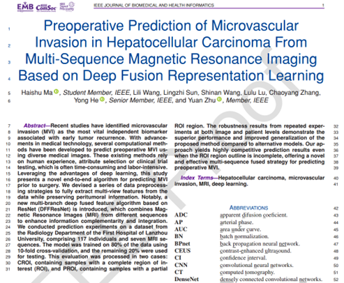 近日,bevictor1946韦德官网朱媛副教授研究团队联合兰州大学第一医院放射科王莉莉博士展开生物医学信息学合作研究,在生物医学和健康信息学国际顶级期刊 IEEE Journal of Biomedical and Health Informatics(简称IEEE JBHI)上在线发表了关于肝癌微血管侵袭预测的理论研究成果,题为: “Preoperative Prediction of Microvascular Invasion in Hepatocellular Carcinoma From Multi-Sequence Magnetic Resonance Imaging Based on Deep Fusion Representation Learning”。bevictor1946韦德官网(武汉)2021级本科生马海书、朱媛副教授及兰州大学第一医院放射科王莉莉博士为该文的共同第一作者,朱媛副教授为通讯作者,bevictor1946韦德官网(武汉)bevictor1946韦德官网为唯一通讯单位。