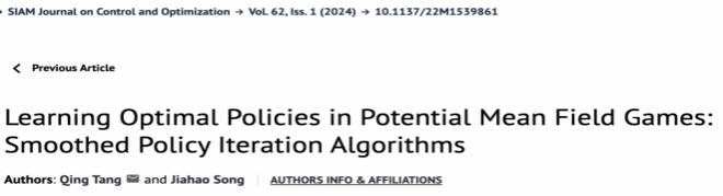 公司信息与计算科学系教师汤庆博士作为通讯作者的工作 “Learning Equilibria in Cournot Mean Field Games of Controls” 最近发表于SIAM Journal on Control and Optimization。