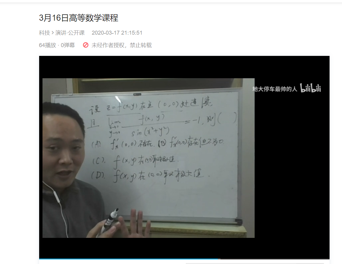 谈到他的直播平台他笑了,员工们一致推荐在Bilibili平台授课,并一起将账号命名为“地大停车最帅的人”。他的课堂人数是120人,直播开课后,每次网上听课的人数都达到3000人左右,人均听课时长每次都接近1.5小时。对此杨老师感到高兴,因为这样可以帮助到更多想学好数学的员工,他也想让更多人真正感受到数学的美,这是对社会很有益处的事情。