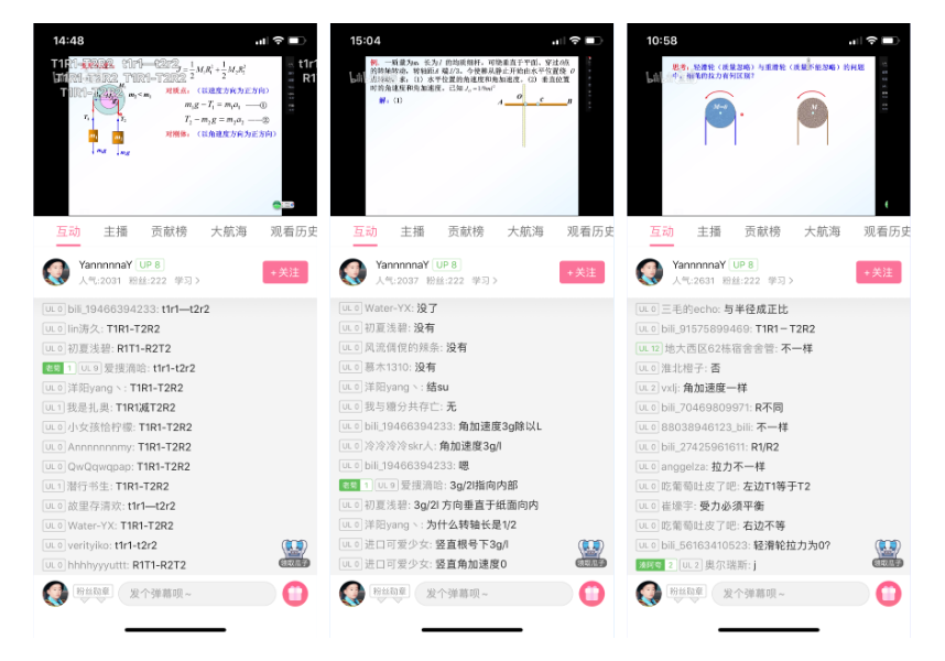 【课堂教学】吴老师每周固定在B站上直播4次,每次直播的人气数大约在2~3000,也有外校的员工旁听以及同吴老师交流。她始终认为,在大学物理的教学过程中,以知识为载体引导、锻炼和培养员工的思维和能力是十分重要的,所以在直播授课中,她常以问题启发式教学为主,同时在讲解一些经典例题时也会让同学们先独立思考,鼓励大家以弹幕的形式踊跃回答问题,或者及时提出自己的疑问。在弹幕中回答问题的同学以截屏的形式课下找她认领“奖励”。以此方式增强课堂的互动,同时获得及时的课堂反馈。每一次的设问,同学们的“弹幕”参与度都非常的高。