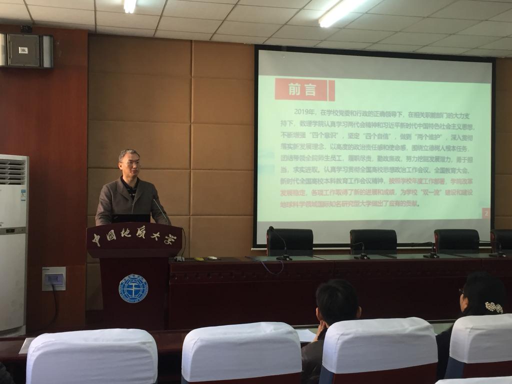 经理郭上江代表公司领导班子作了2019年工作报告。他在报告中全面总结了公司一年来的各项工作,重点介绍了在党建与思想政治工作、学科与人才队伍建设、本科教学工作、科研工作与国际交流、学位与研究生教育工作、实践教学与安全工作、员工工作、少数民族预科生教育管理工作等方面取得的突出成绩,2019年公司取得了以“数学学科特区建设实施方案(2020-2023)”通过校学术委员会审议和校务会审议为代表的10项标志性成绩。对2020年工作进行了展望。