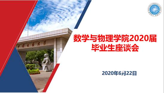 会议首先由公司党委书记吴太山寄语。吴书记首先代表公司党委对毕业生们即将顺利毕业表示祝贺。吴书记结合今年抗击疫情的大背景和形势,充分肯定了数理学子在抗击疫情过程中所作出的贡献。同时,吴书记对毕业生们也提出了两点希望:一是希望大家无论升学还是工作,都要心系国家,服务人民,不忘初心,牢记使命;二是希望同学们心系地大,踏入工作岗位了也能多关心母校、母院的发展,有时间常回地大看看。
