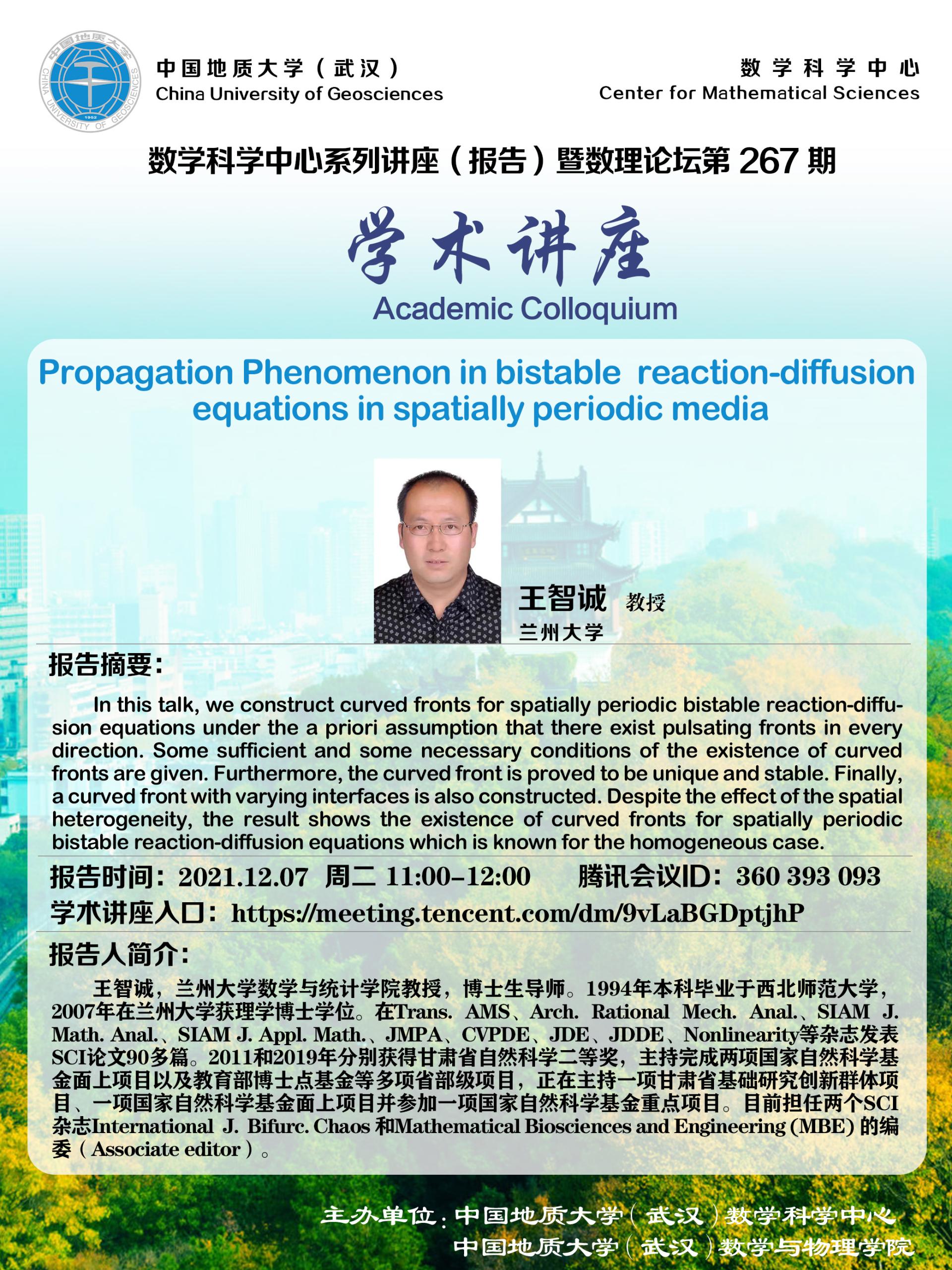"数理论坛"第267期暨数学科学中心系列讲座(报告):Propagation Phenomenon in bistable reaction-diffusion equations in spatially periodic media